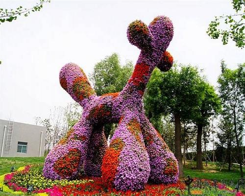 “綠雕”被譽為世界園林藝術(shù)的奇葩,是一種有生命的植物雕塑。一般內(nèi)設(shè)鋼材構(gòu)架,然后在構(gòu)架上填充栽培土,再于其上種植一年生或多年生小灌木或草本植物,即采用掛泥插草或卡盆工藝把不同顏色的花草覆蓋在結(jié)構(gòu)造型的表面,巧妙地把雕塑造型與花卉園藝結(jié)合在一起,鋼架表面的植物覆蓋率至少要達到80%。因此,綠雕是充滿生機的“花卉雕塑”,是人類運用自然力量創(chuàng)造出的又一園藝文明。