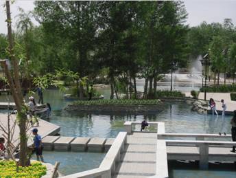 設計采用混合式布局方式,以植物造景為主,滿足了區域內步移景異的要求,以及能從平視及從高層鳥瞰都有良好的景觀效果,并做到了"三季有花、四季常青"。通過植物景觀的設計,營造出"一樹孤賞,二樹對植,三樹叢植,四樹滴翠,萬花饒艷"的優美環境。設置人工湖泊、水池、建筑小品、園路小徑,放置園燈、凳椅,既滿足了方便車輛通行和人流集散的功能,又為市民休息、散步、交往、娛樂提供了場所。