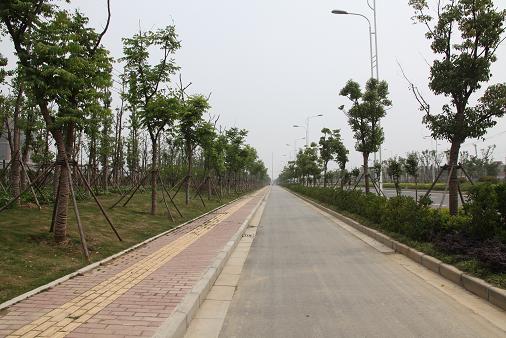 根據設計要求,種植了櫸樹、金桂和紅花繼木球,并用大面積的白花三葉草、花葉蔓長春、法冬籬做背景和稱托。上木常綠樹香樟與落葉樹合歡,中層紫薇與法冬柱,下木紅花繼木和金森女貞,體現不同季節的色彩。通過設計變更,增加了道路西側綠地的綠化,種植了包括行道樹在內的黃山欒樹、廣玉蘭、銀杏、香樟等,既為民宅、商業區與道路間做了自然的屏風,又增添了盎然的綠意。