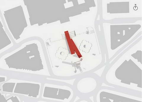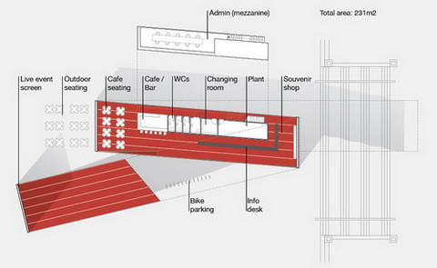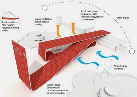 第三名的方案是由美國建筑事務所dowling duncan的建筑師matthew clare、rob duncan、krista mollion和nikolay grozev設計的。他們在廣場中設計了一個彎曲的跑道,讓參觀者能夠與奧運會建立一個物理上的聯系。跑道在立面形式上隨著廣場的起伏而高低錯落。參觀者可以走到跑道頂端,俯瞰整個特拉法加廣場的景色。跑道是用耐克的橡膠鞋底材料制作的,體現了此次奧運會的可持續性。