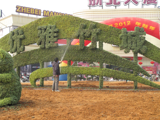 這幾天,浙江安吉縣安吉生態(tài)廣場(chǎng)上一處大型主題雕塑格外引人注目:這些雕塑不是用傳統(tǒng)材料雕刻,而是用鋼筋搭好“骨架”,內(nèi)部填上輕質(zhì)營(yíng)養(yǎng)土,再用綠色植物覆蓋而成,看上去就像是用綠色植物雕刻出來(lái)的植物雕塑。整座雕塑分為兩個(gè)主題,西面為“優(yōu)雅竹城”,東面是“美麗鄉(xiāng)村”。從安吉縣城市管理行政執(zhí)法局園林綠化管理處了解到,這是目前為止安吉縣最大的一處立體花壇,今后,園管處還將繼續(xù)推廣這種既環(huán)保,又美觀的立體花壇。