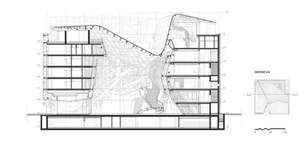 意大利館是使用復雜和創新性的材料和技術的建筑和結構的挑戰。建筑以一種可持續的方式運行,主要因為屋頂光伏玻璃和新混凝土的光催化性能的設計。2000噸的活性生物混凝土用于了所有700塊不同的分支面板上,4000平方米的帆罩用鋼400噸。