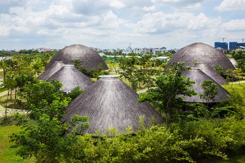 在越南胡志明市西貢河附近,由越南武重義建筑事務所設計的八個大小不同的竹棚屋聳立在公園茂密的樹林里,它們用作鉆石島公寓的多功能社區空間。