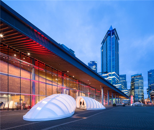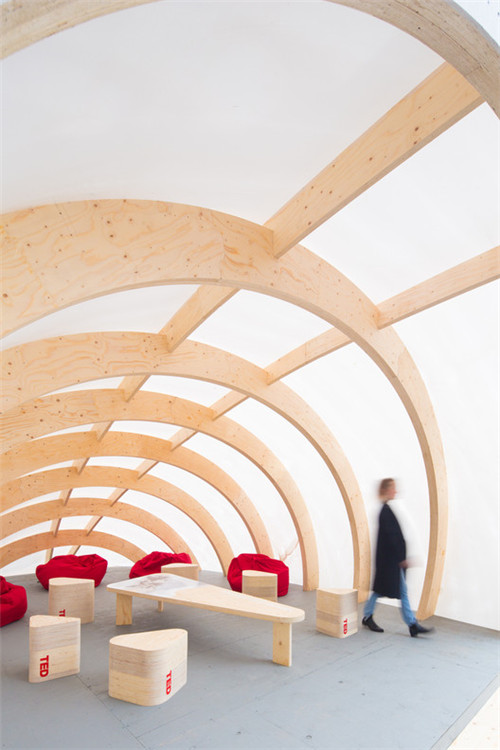 這組溫暖的小屋由METSAWood捐贈的高級木制品LaminatedVeneerLumber(LVL)建成,并以CNC雕刻而成。該結構被逐漸縮小的表皮包圍,讓TEDsters與外界元素隔開,并創造一個溫暖的具有暴露天然木材的室內空間。每個小屋都擁有一張大桌子和若干小凳子,將溫暖的小屋變成一個大的休息區,游客可以聚集在一起或休息。