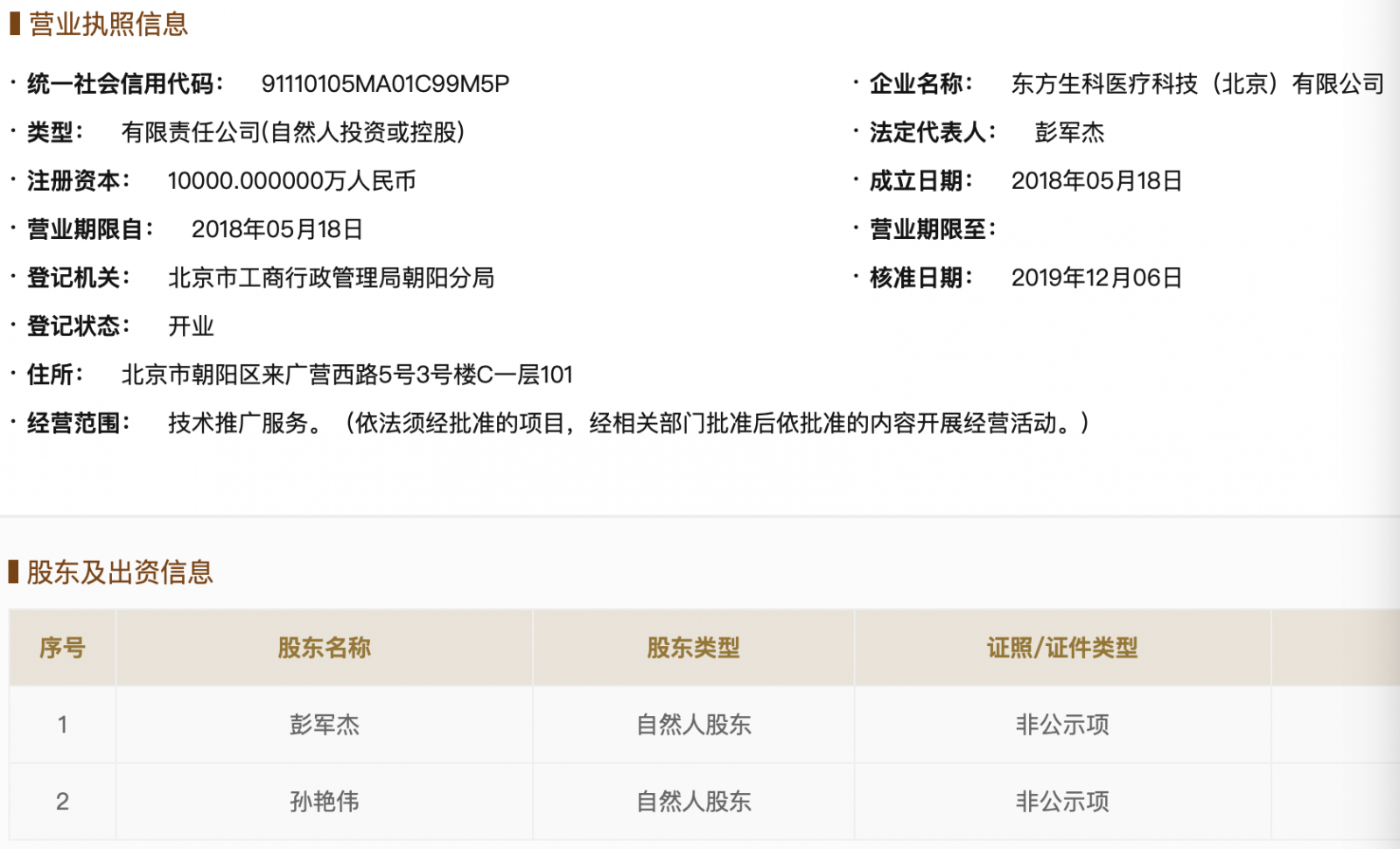目前,東方生科的大股東是彭軍杰,持股比例90%,認繳出資額9000萬元,二股東為孫艷偉,持股比例10%,認繳出資額1000萬元。