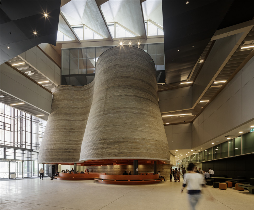 The major interior spaces have a specific character. The brick towers are reminiscent of pottery kilns at Stoke-on-Trent, England – a reference to the process of firing that starts with a malleable clay is abstractly akin to the process of learning.The perimeter roof is a series of folded light monitors that encompass the uppermost floor. The roof geometry introduces varied qualities of natural light whilst screening the glare of low-angle sunlight from the east and west.