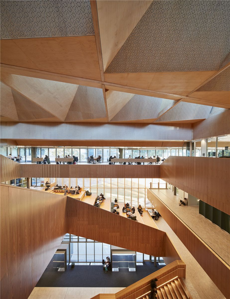 教學樓的一樓大廳水平通透設計,校園內可清晰看到在內部發生的活動,并且為師生進入教學樓提供了更便捷的入口。樓梯的設計也是別出心裁,既保證了功能又提供了社交場所。促進了校園社區之間的意外碰撞。