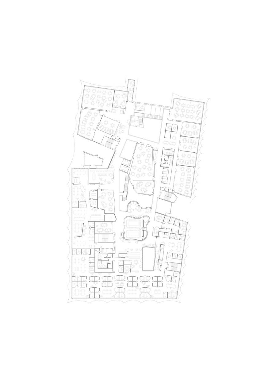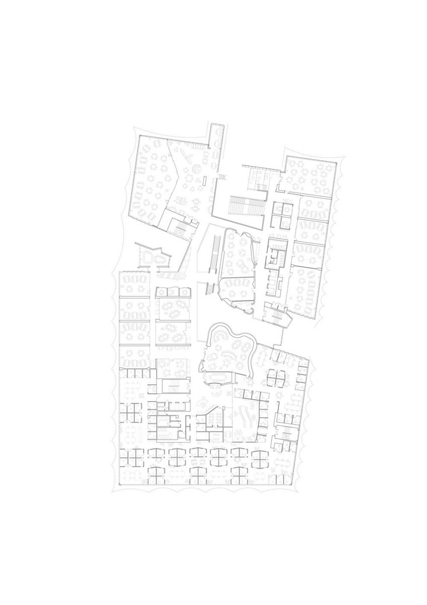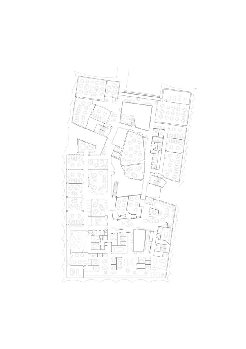 平面圖的中心是一個鋸齒形的屋頂,將南面散射的光線引入到內部。 菱形天窗的圖案將建筑物的公共空間與來自上方的自然光連接起來并結合在一起。