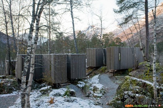 中國風景園林網訊 Gudbrandsjuvet的這家園林旅館占地800平方米,由當地居民Knut Slinning 發起,Jensen和Skodvin于2004年至2007年間設計,2008年建成。